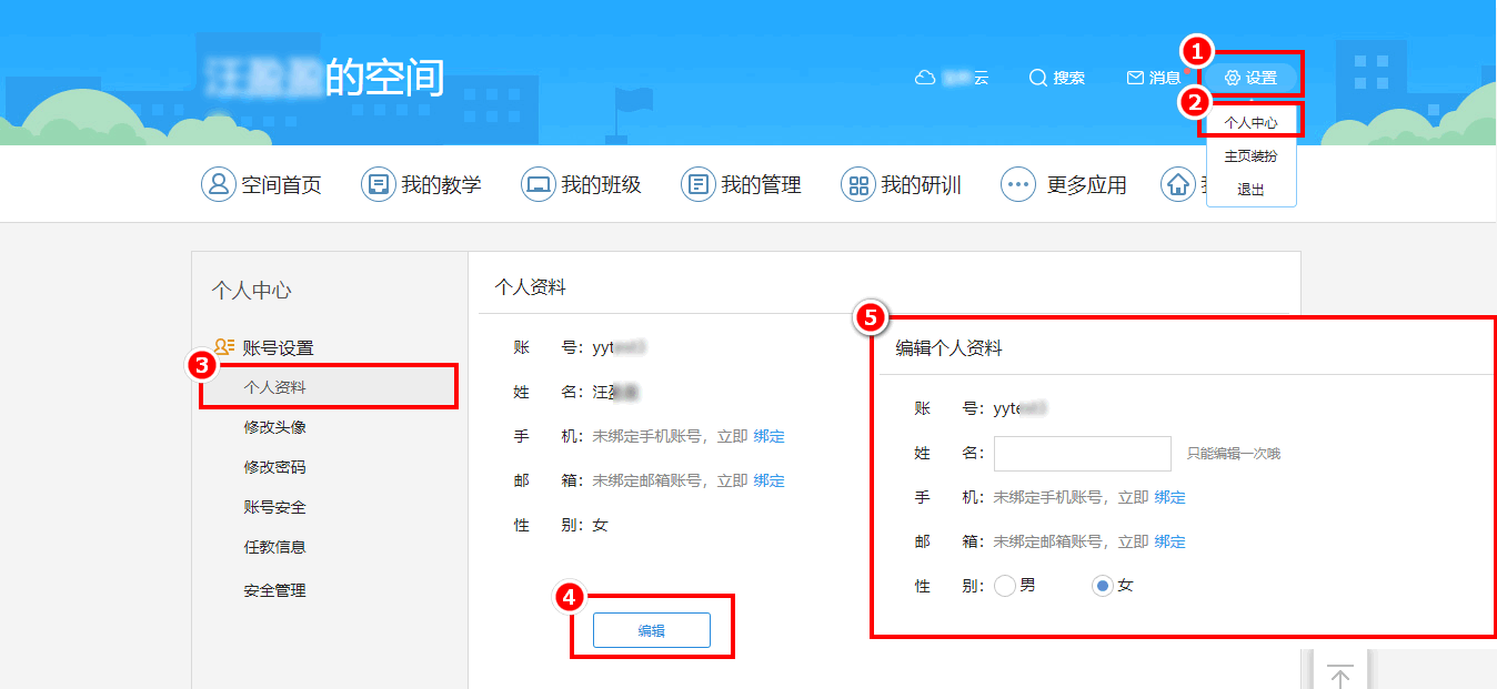 登录当地教育云平台,进入个人空间,在“设置”—“个人中心”—“个人资料”内点击“编辑”接口在姓名更改姓名,只能更改一次哦。