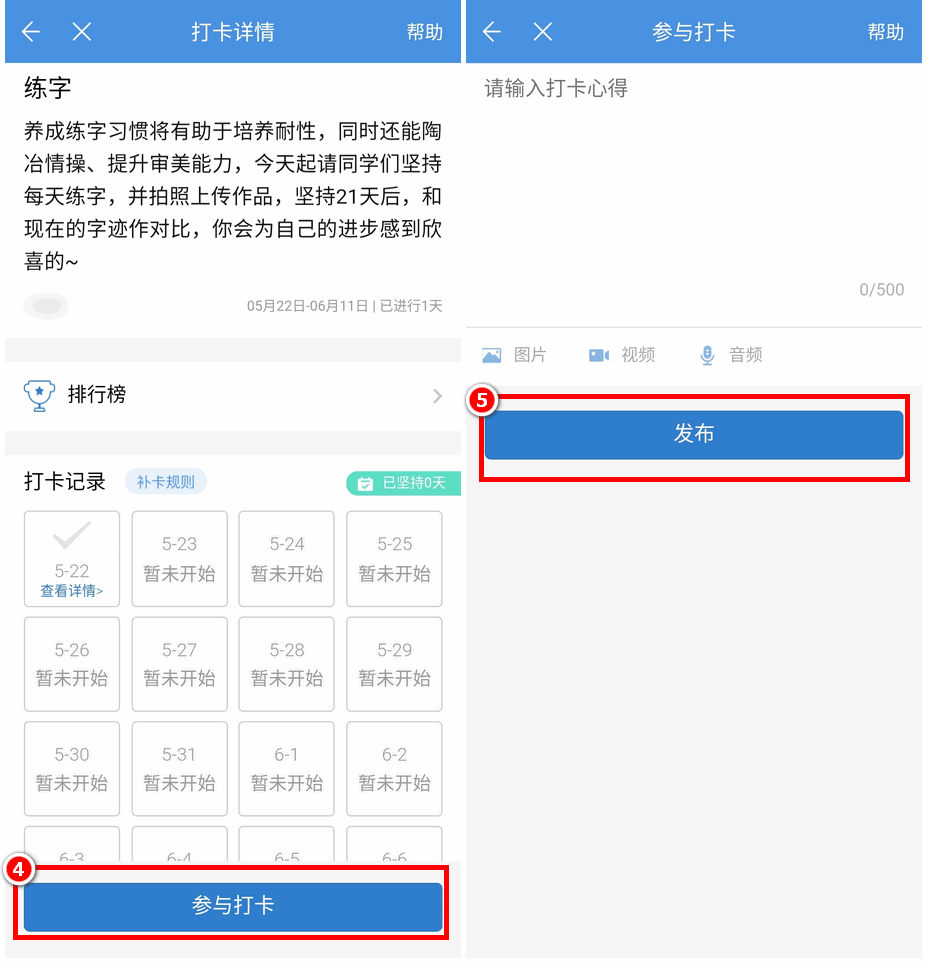 第三步:在打卡详情页,点击“参与打卡”,可上传图片、视频、音频和文字等不同形式的打卡心得,完成打卡。