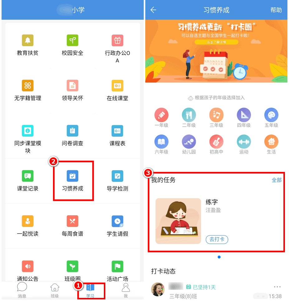 第一步:学生登录APP,点击下方“学习”,找到“习惯养成”应用进入。