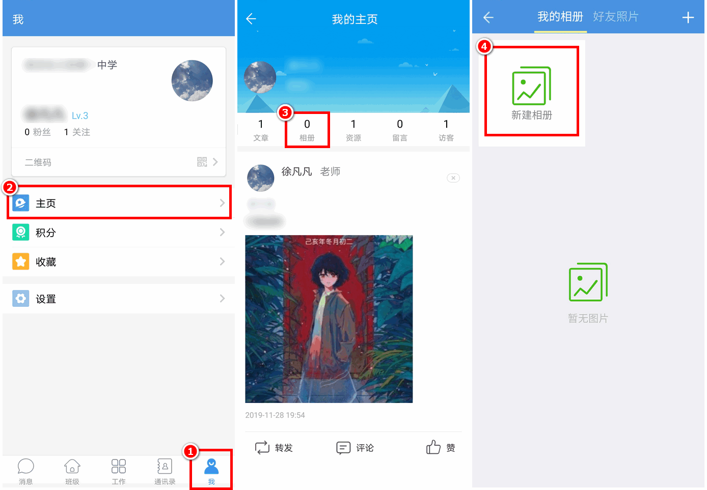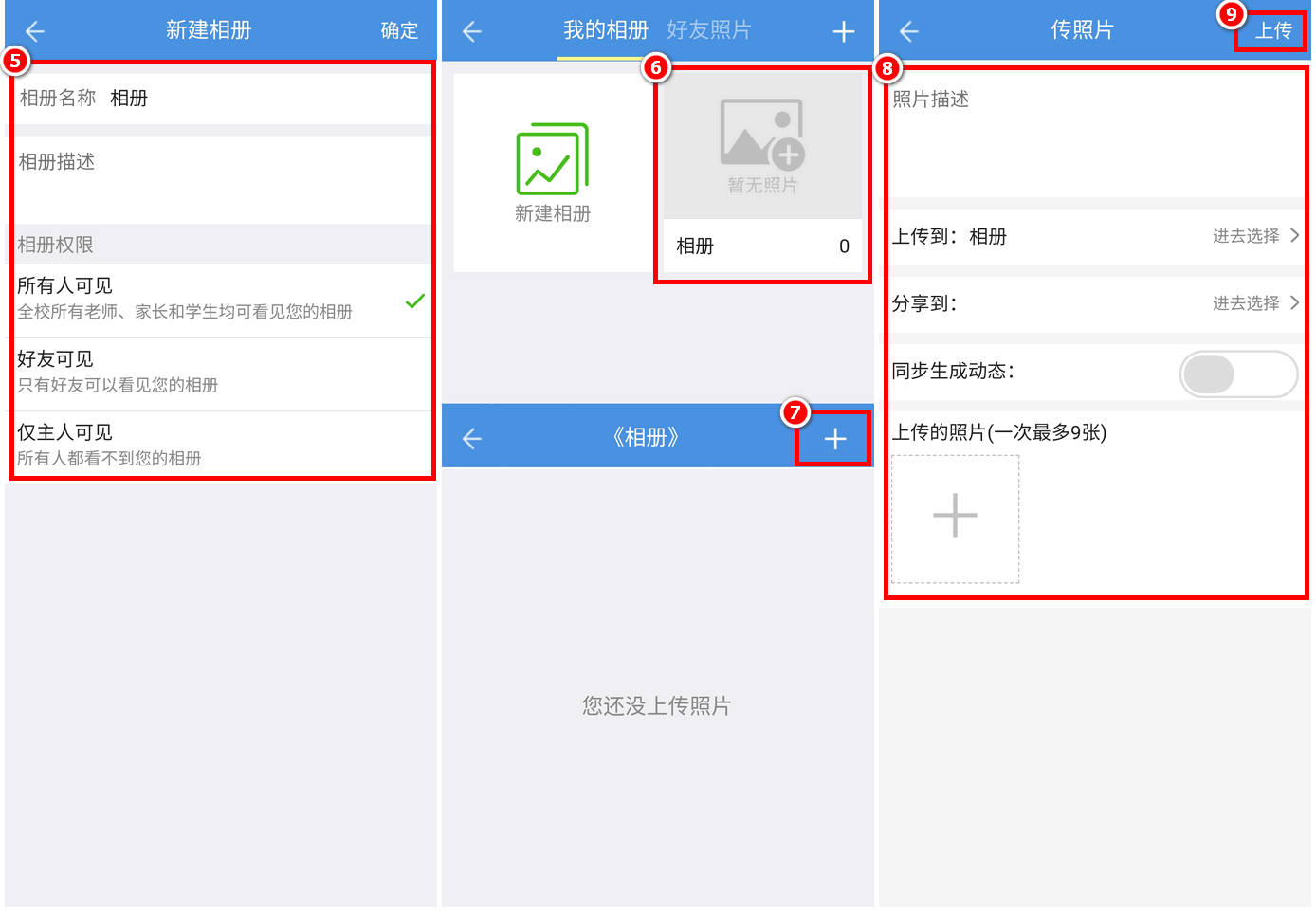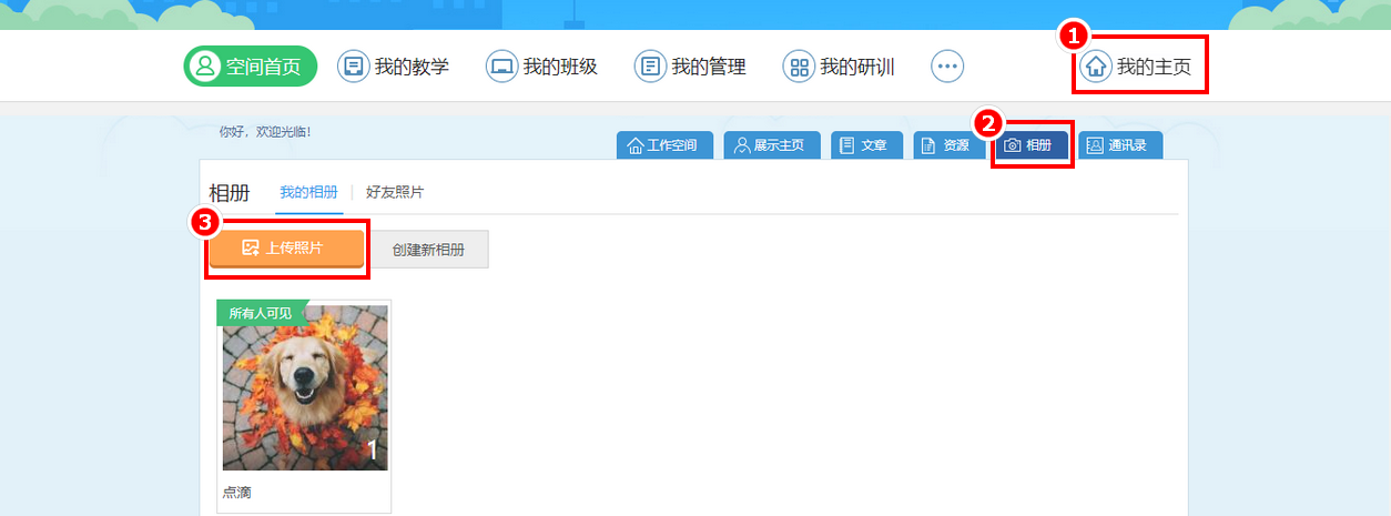 账号密码登录当地教育云平台,点击进入“我的主页”,点击“相册”-“上传照片”即可。