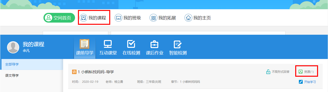 导学检测资源:点击“我的课程”可以查看到老师发布的导学、检测、课后作业及互动课堂记录的资源。