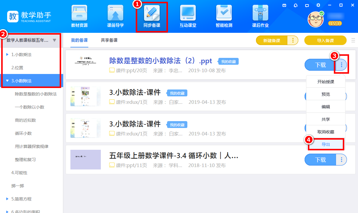 方式一:登录教学助手,在“同步备课”—“我的备课”中选择需要导出的课件点击右侧三点符号进行导出;