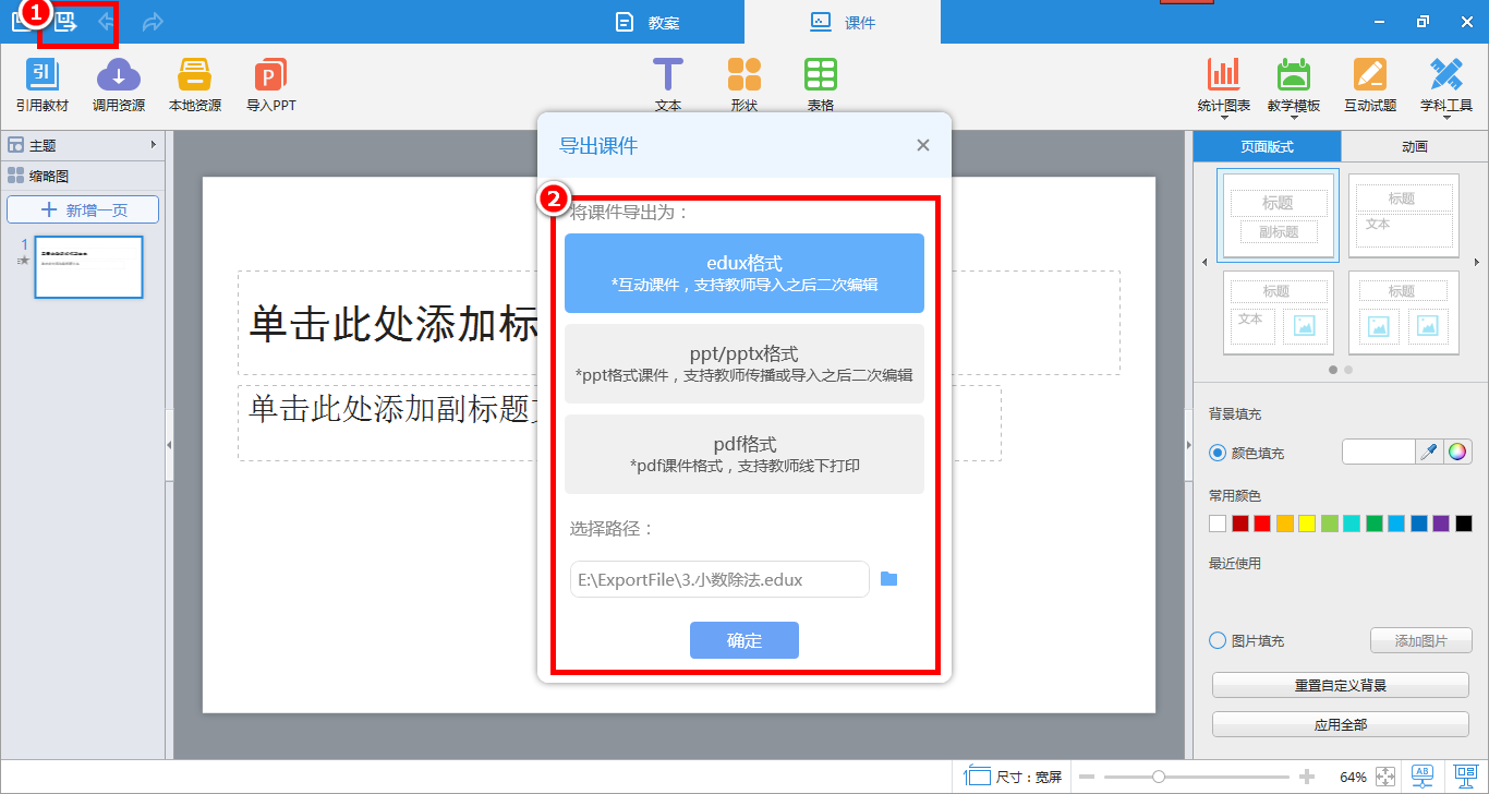 方式二:在课件编辑器界面,编辑好后点击左上角的另存为按钮,选择需要导出的文件格式、路径,点击“确定”即可开始保存导出,如导出过程时间较长请耐心等待。