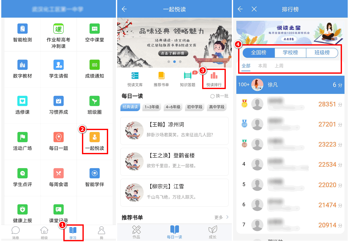 学生登录APP点击页面下方的“学习”-“一起悦读”;进入后点击上方的“悦读排行”模块,在该模块中,您可以看到自己在全国、学校和班级中的悦读排行。