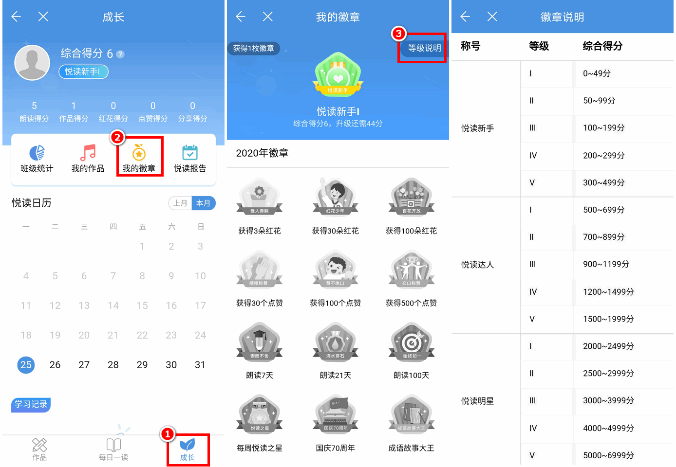 2.“活动徽章”中每个徽章都需满足一定条件方可获得,可查看徽章下方对应的文字知悉获得规则。如“朗读七天”徽章,需要学生朗读七天才可获得。