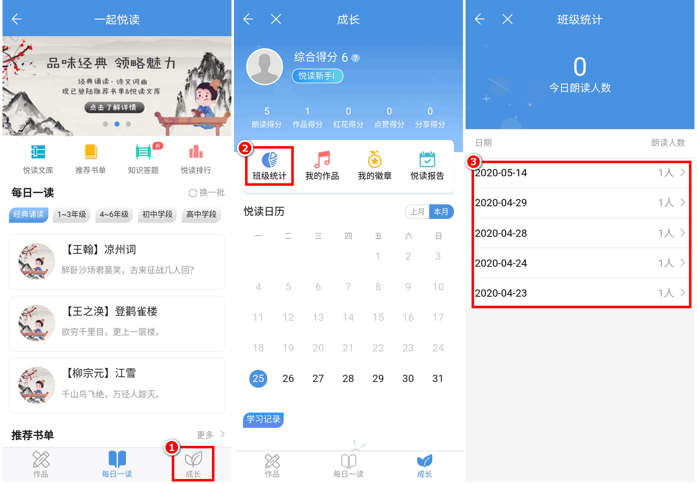 教师登录APP,依次点击页面下方的“工作”-“一起悦读”应用进入。进入后,点击页面下方“成长”-“班级统计”,选择需要查看的时间,进入后可查看当天内的朗读情况,从朗读人数点击进入可查看朗读作品、已朗读学生、未朗读学生。