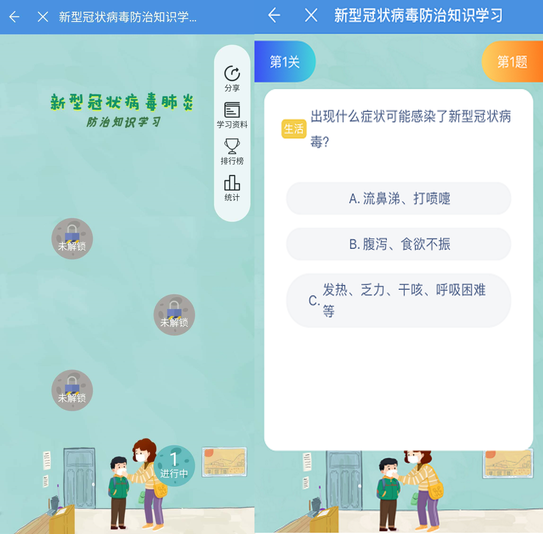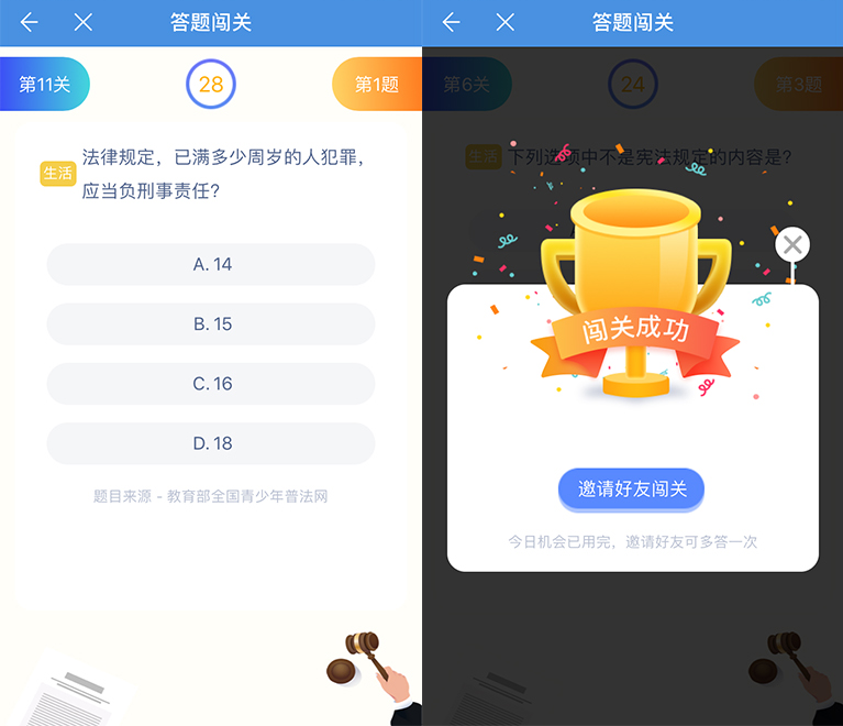 答题闯关:学生在“答题闯关”中有作答时间及作答次数的限制,每道题限时30s内作答,超时未完成视为“闯关失败”,需消耗闯关机会重新作答直至回答正确,分享活动可额外获得闯关机会;