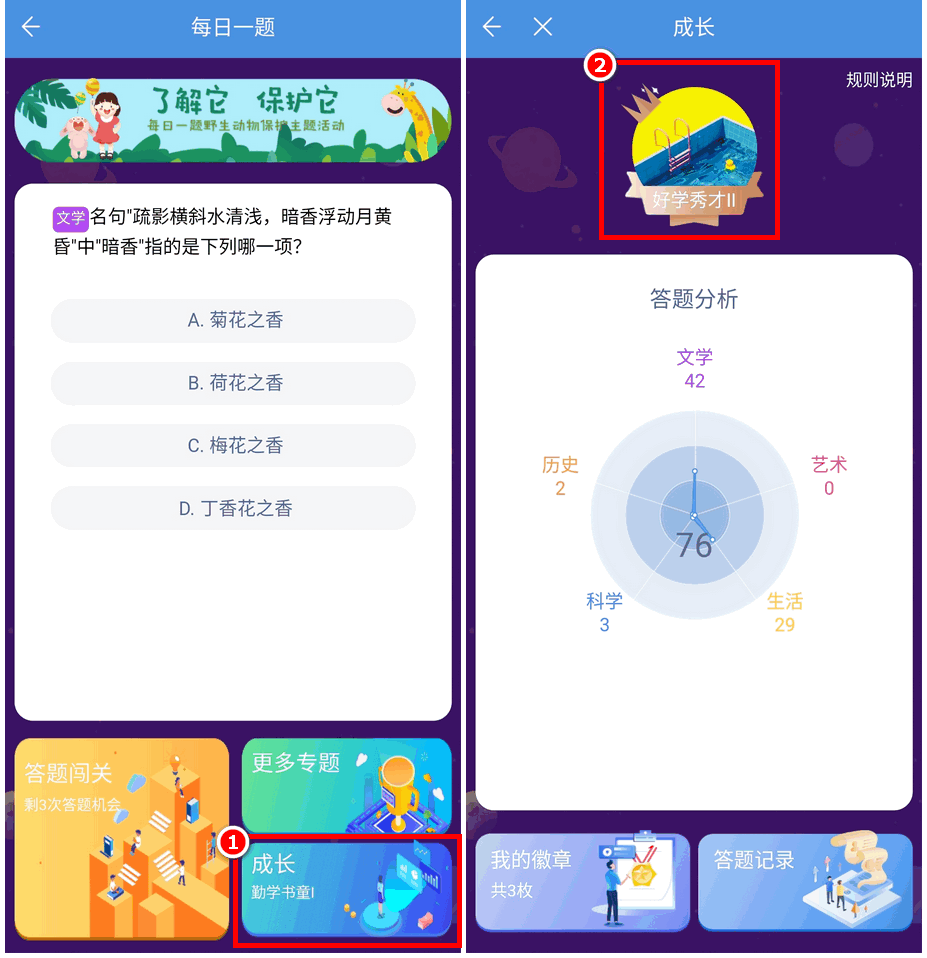 学生登录移动端APP,在“学习”栏目点击进入“每日一题”,点击页面右下方的“成长”,进入后在页面上方可查看自己当前的等级。