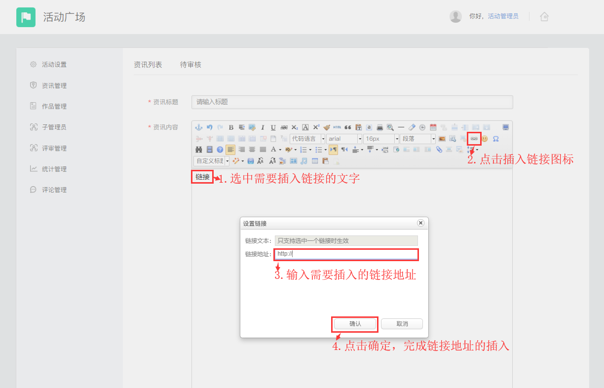 第一步:登录平台,进入【后台管理】-“活动设置”,进入资讯发布页面,选中需要插入链接的内容;