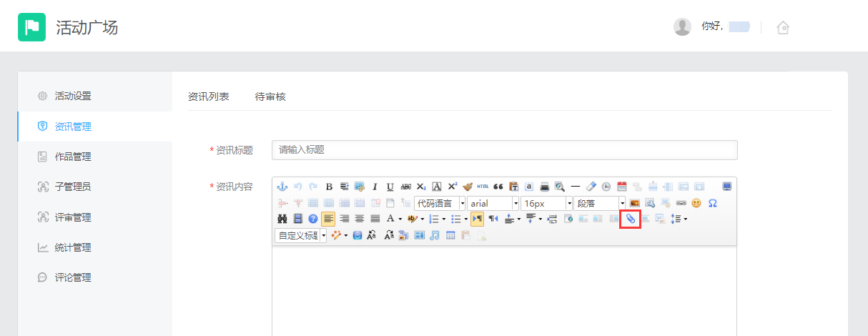 第一步:登录平台,进入【后台管理】-【活动管理】-“资讯管理”-“发布资讯”页面,点击“插入附件”图标,打开附件上传弹窗;