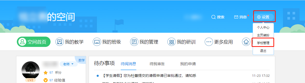 点击个人空间右上方的“设置”菜单下的“学校管理”即可进入学校后台管理页面进行相关管理事务。