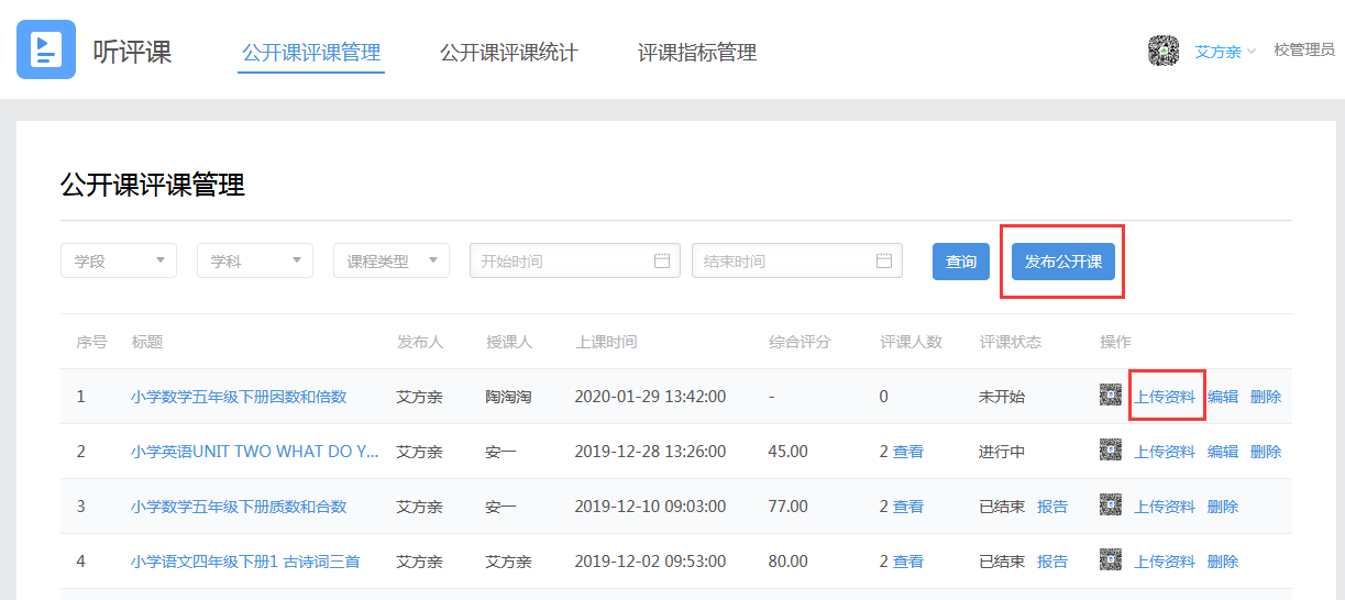 1.进入“公开课评课管理”栏目,点击“发布公开课”;