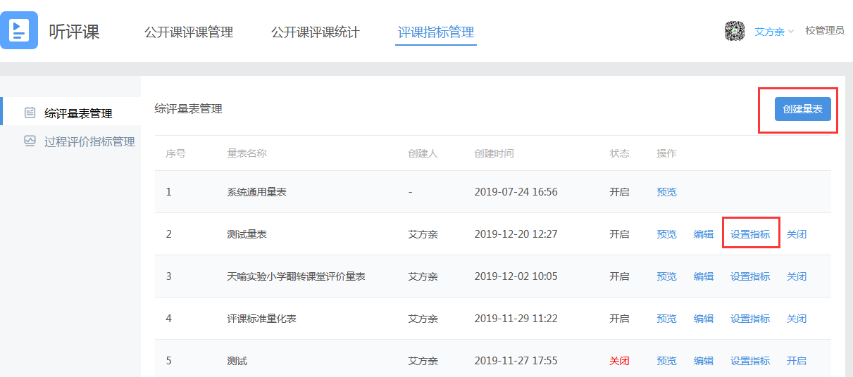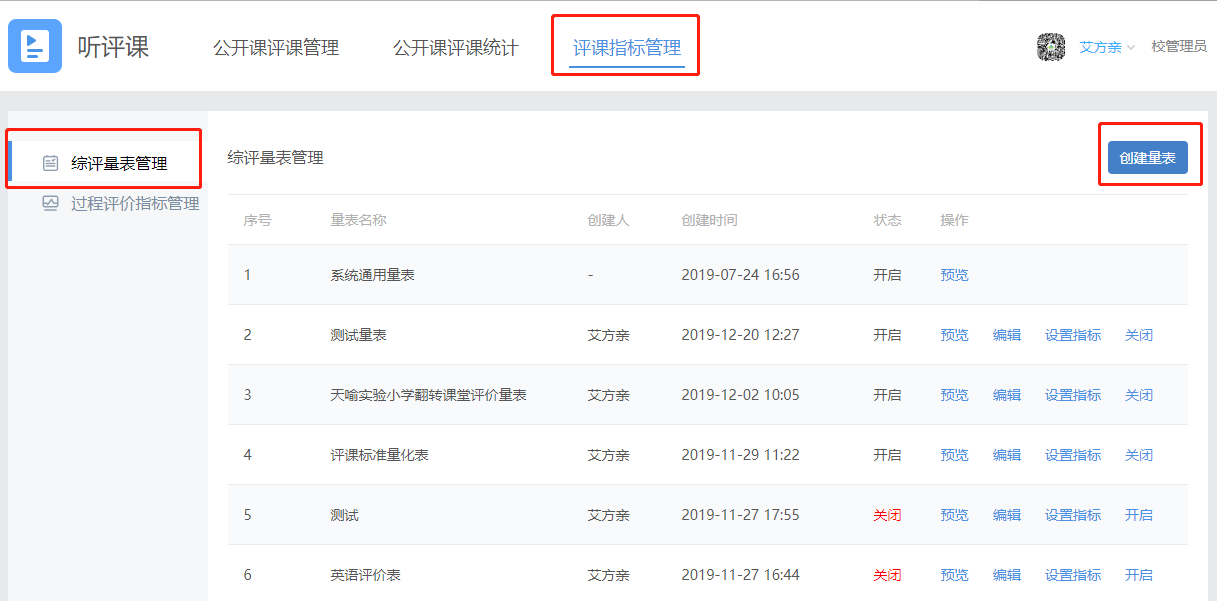 1.进入【评课指标管理】栏目,点击左侧菜单“综评量表管理”;