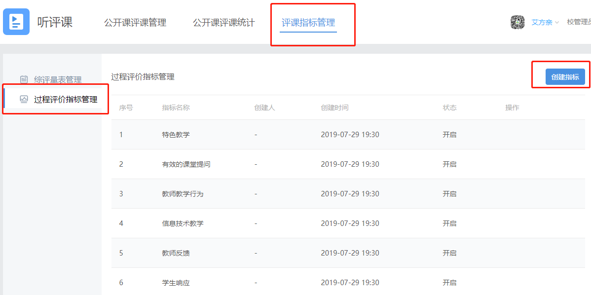 1.进入【评课指标管理】栏目,点击左侧菜单“过程评价指标管理”;