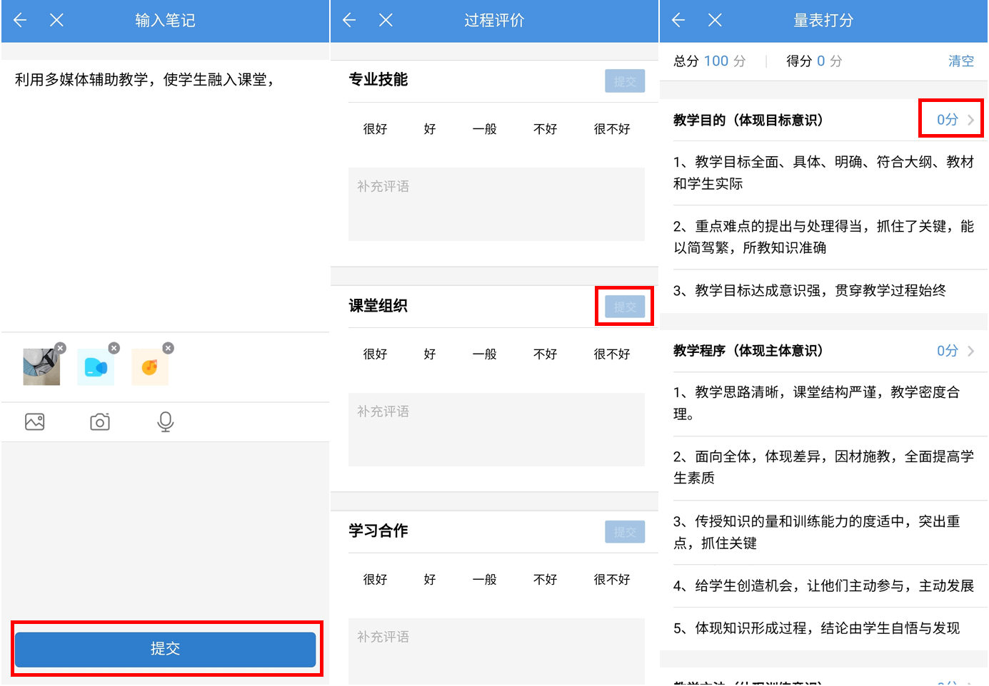在评课开始前,评课人只能查看课程信息和授课老师上传的课程资料,在评课开始后,即可开始提交评课笔记、进行过程点评、综评打分、提交综合评语等操作。