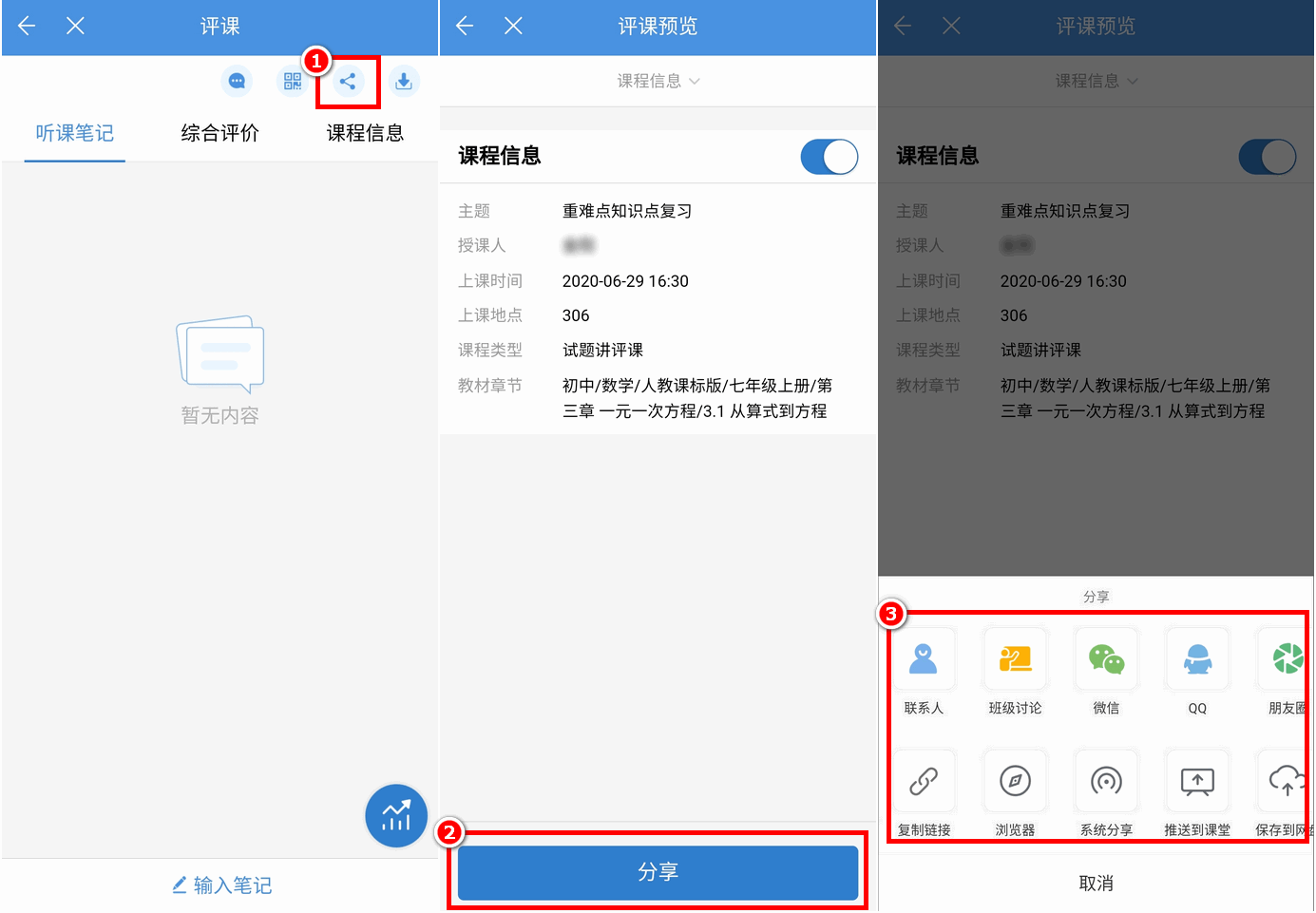 评课人可将自己的评课内容分享到三方应用,包括微信、QQ、朋友圈等。分享出去后,接收对象能查看自己的评课内容。