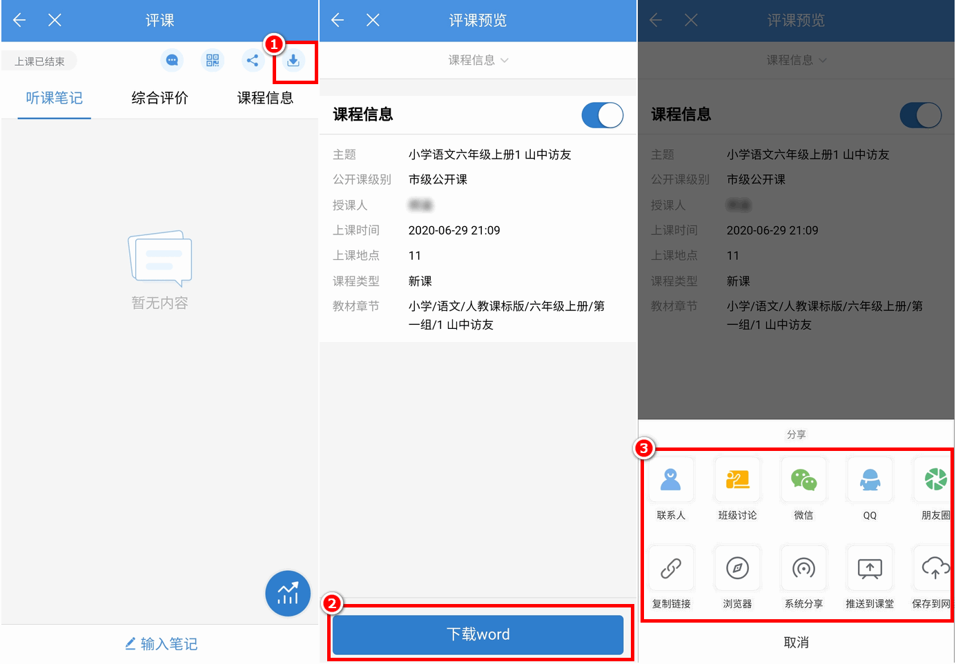 评课人可将自己的评课内容导出为word格式,在移动端进行下载查看。
