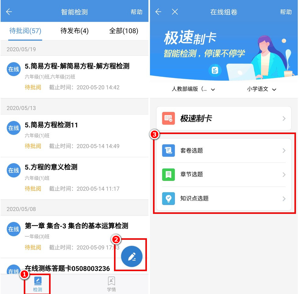 第一步:登录APP进入“智能检测”,在“检测”页面点击右下角笔状图标,点击“章节选题”/“知识点选题”可按照章节或知识点选题;