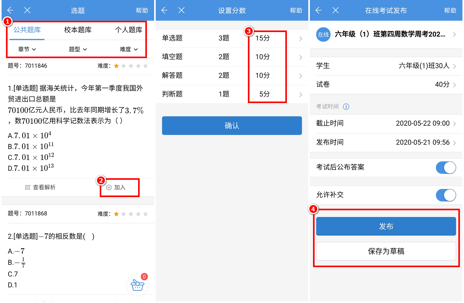第二步:选择题库类型、章节、题型、难度后,点击“加入”即可将题目加入到试卷篮。可在试卷篮里调整题目顺序或删除,点击“布置测练”即可给题目设置分数,点击“确认”即可完成组卷。