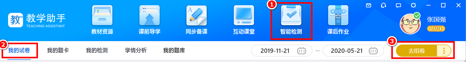 第一步:教师登录教学助手,在“智能检测”—“我的试卷”栏目点击“去组卷”,即可进入选题组卷。