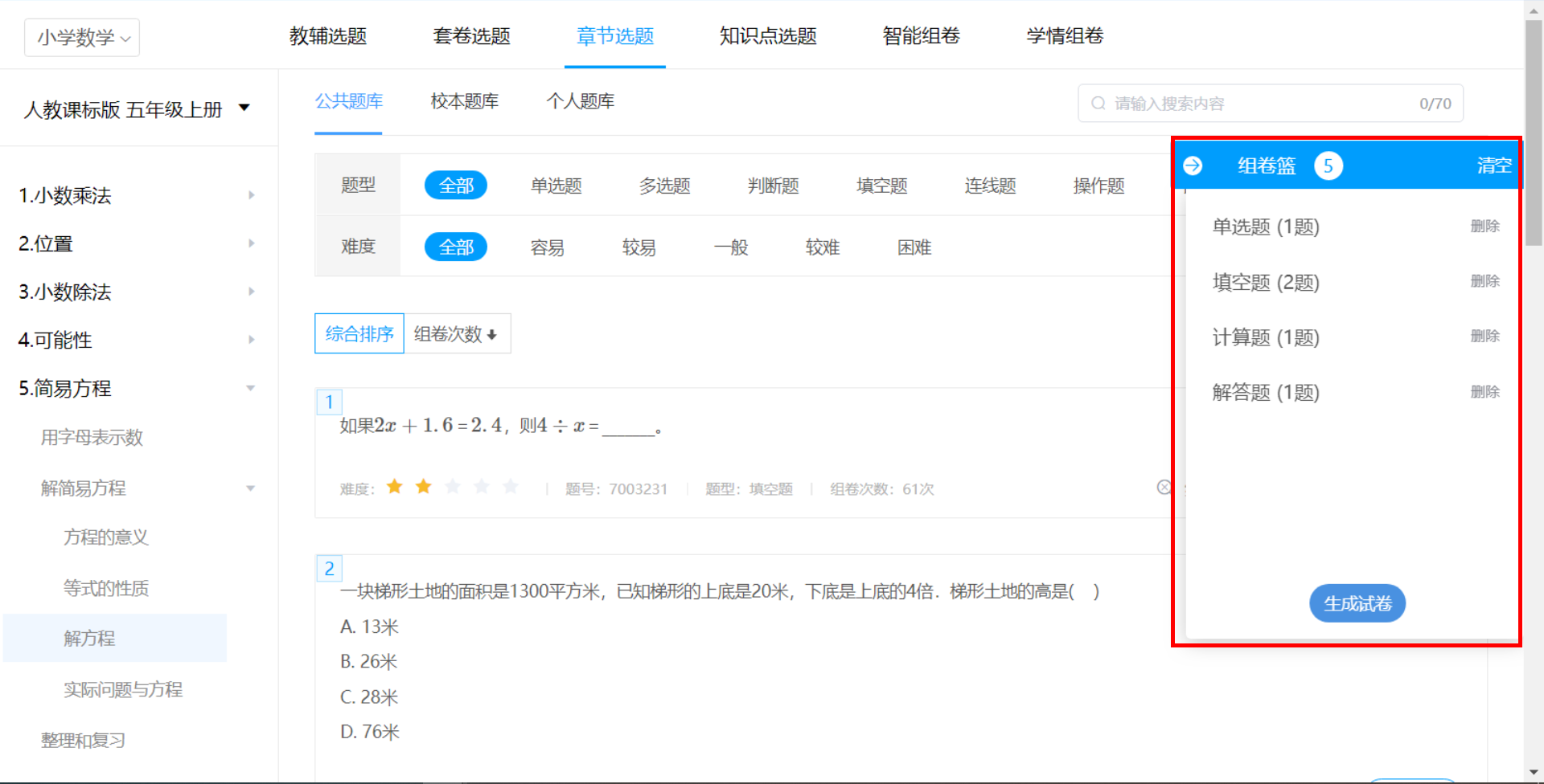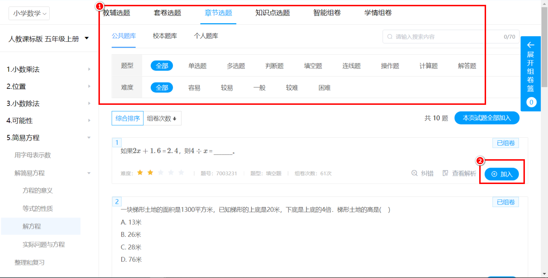 第二步:通过“教辅选题”、“章节选题”、“知识点选题”,勾选学段学科、册别、章节,可以在“公共题库”、“校本题库”、“个人题库”中按照“题型”和“难度”进行筛选,点击“加入”即可将题目加入到组卷篮;