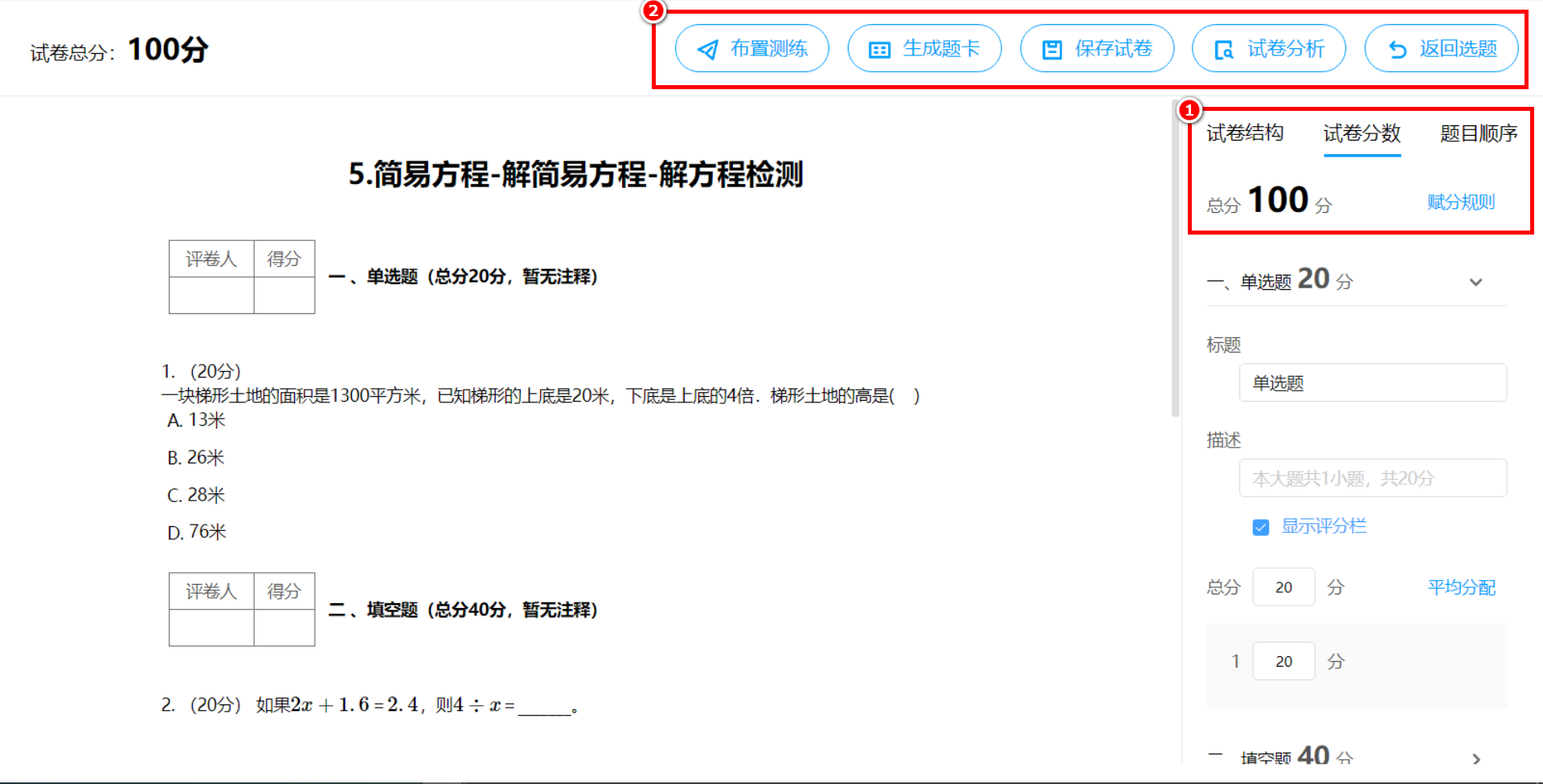 第四步:可在右侧调整“试卷结构”、“试卷分数”、“题目顺序”,点击“试卷分析”还可查看这份组卷的分析。点击“保存试卷”即可在“我的试卷”中找到此次组卷。