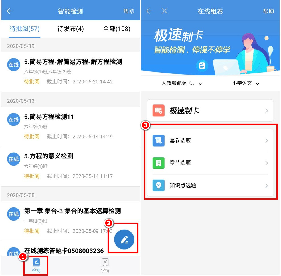 教师登录APP进入“智能检测”,在“检测”界面点击右下角的按钮,可以直接生成在线题卡,或者选题组卷发布。注意,人人通只能发布“在线作答”形式的测练。