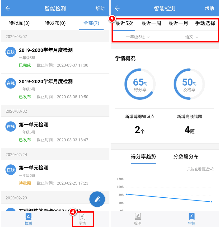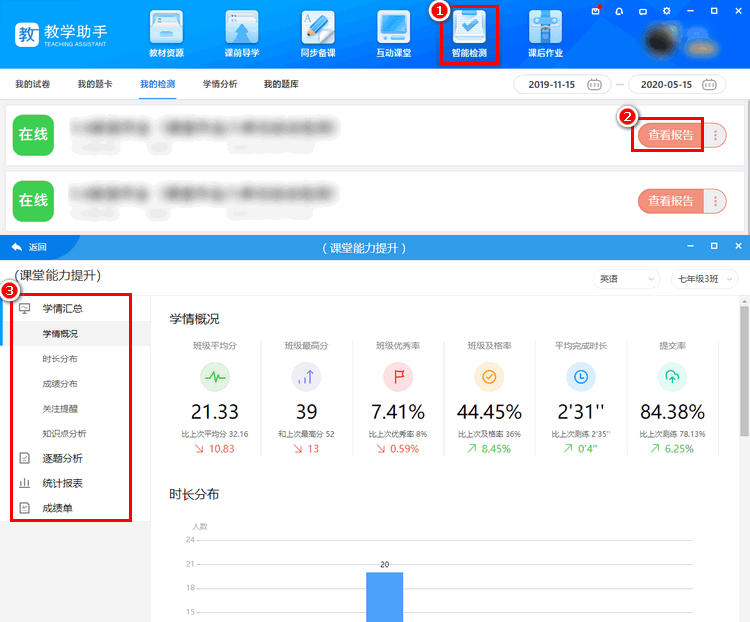 登录教学助手PC端在“智能检测”的“我的检测”中找到进入对应的检测,点击“查看报告”即可;点击“学情汇总/逐题分析/统计报表”即可查看学情分析报告。