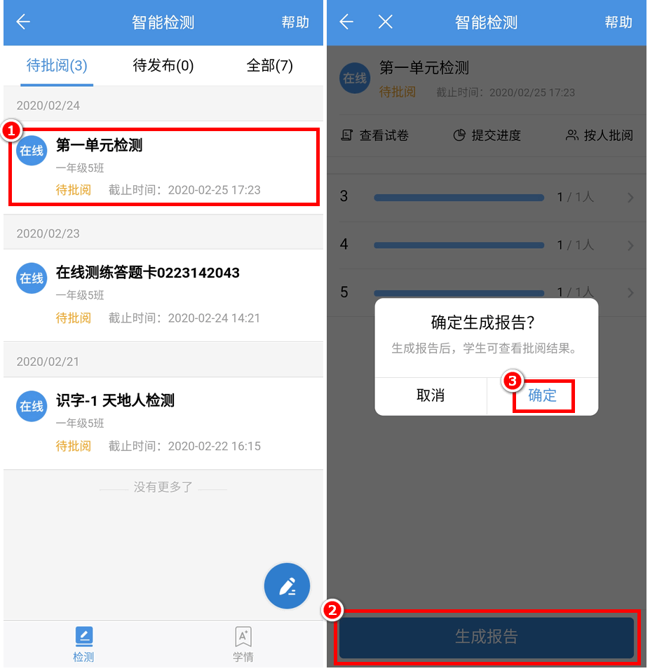 在APP的“工作”—“智能检测”—找到并点击进入对应的检测,点击“生成报告”即可,查看学情请在人人通空间APP的“工作”—“智能检测”底栏切换“学情”。