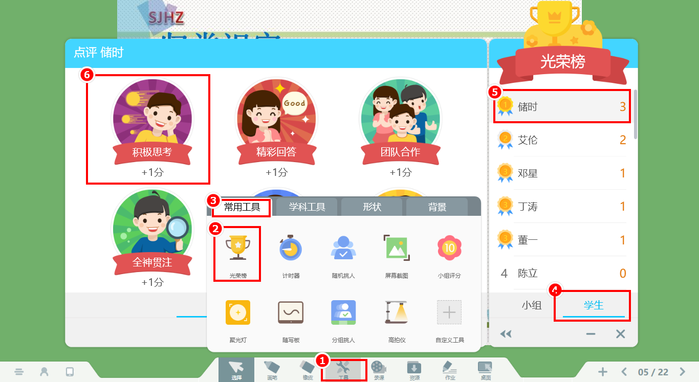 在“工具”—“常用工具”中点击“光荣榜”,在“学生”栏目可对单个学生进行加分鼓励和减分警告。