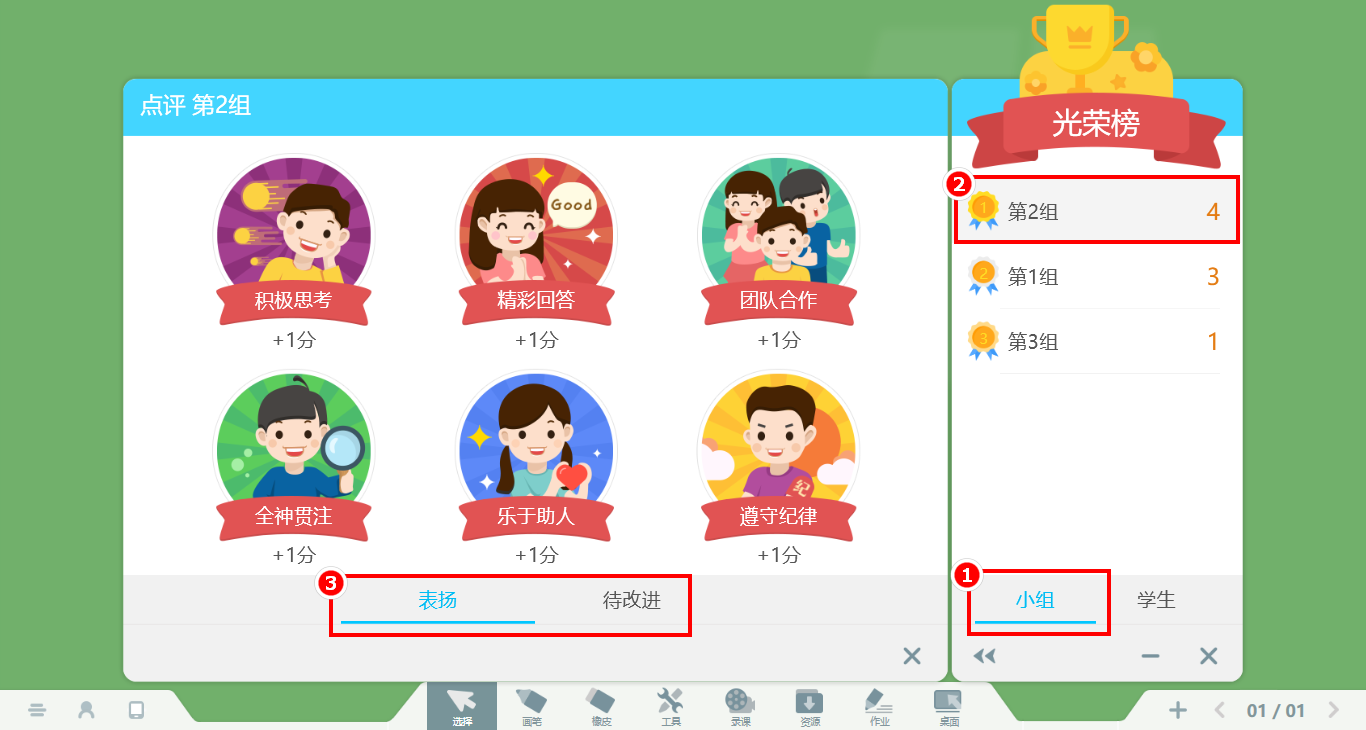在“小组”一栏可按照分组进行加分鼓励和减分警告。