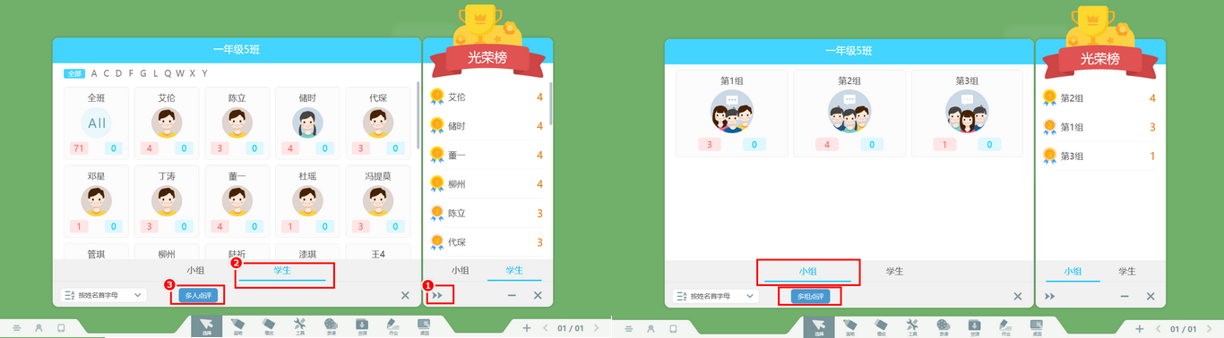 点击双箭头图标,还可在“学生”栏目进行多人点评,在“小组”栏目进行“多组点评”。