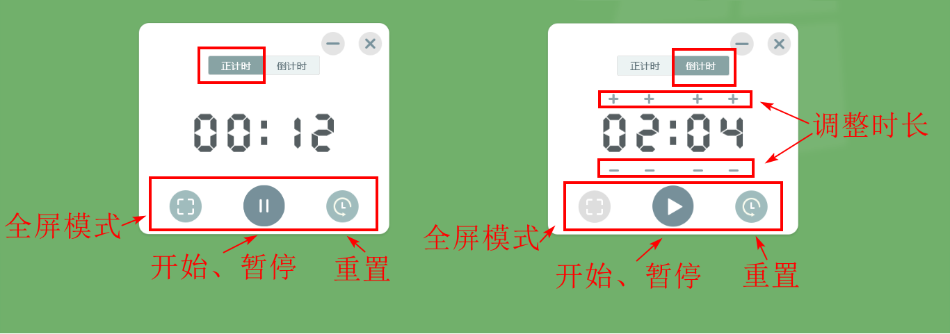 在“工具”—“常用工具”中点击“计时器”,有“正计时”和“倒计时”两个选项。正计时点击中间按钮即开始计时,点击左边按钮可以放大为全屏模式,任意点击一下鼠标,即可退出全屏,点击右边按钮,可以重置计时器。“倒计时”点击加号和减号来调整时长。
