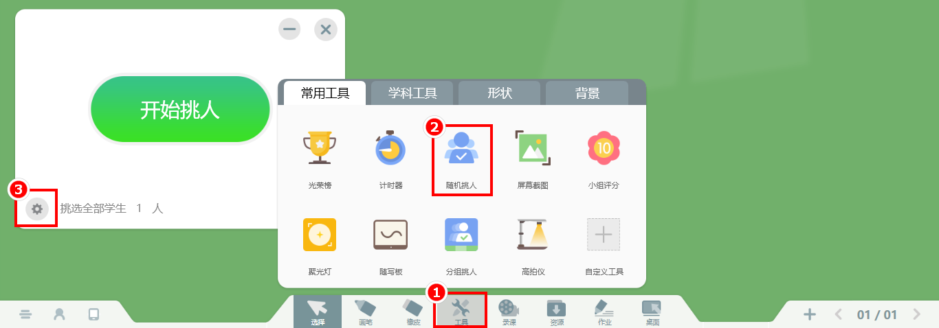 在“工具”中点击“随机挑人”,点击设置图标可进行设置;