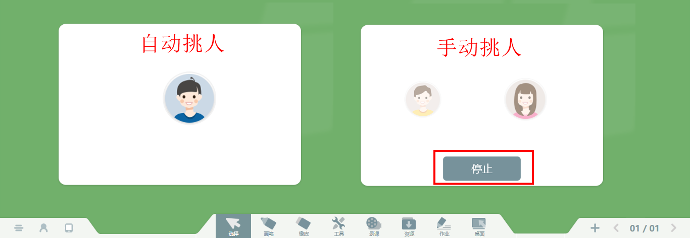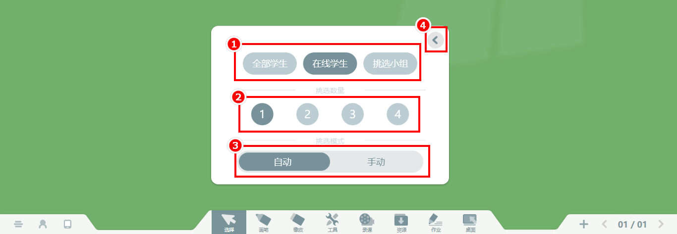 在设置界面可选择在“全部学生”或“在线学生”中挑选,还可“挑选小组”。还可设置一次挑选的人数,手动挑选还是自动挑选;