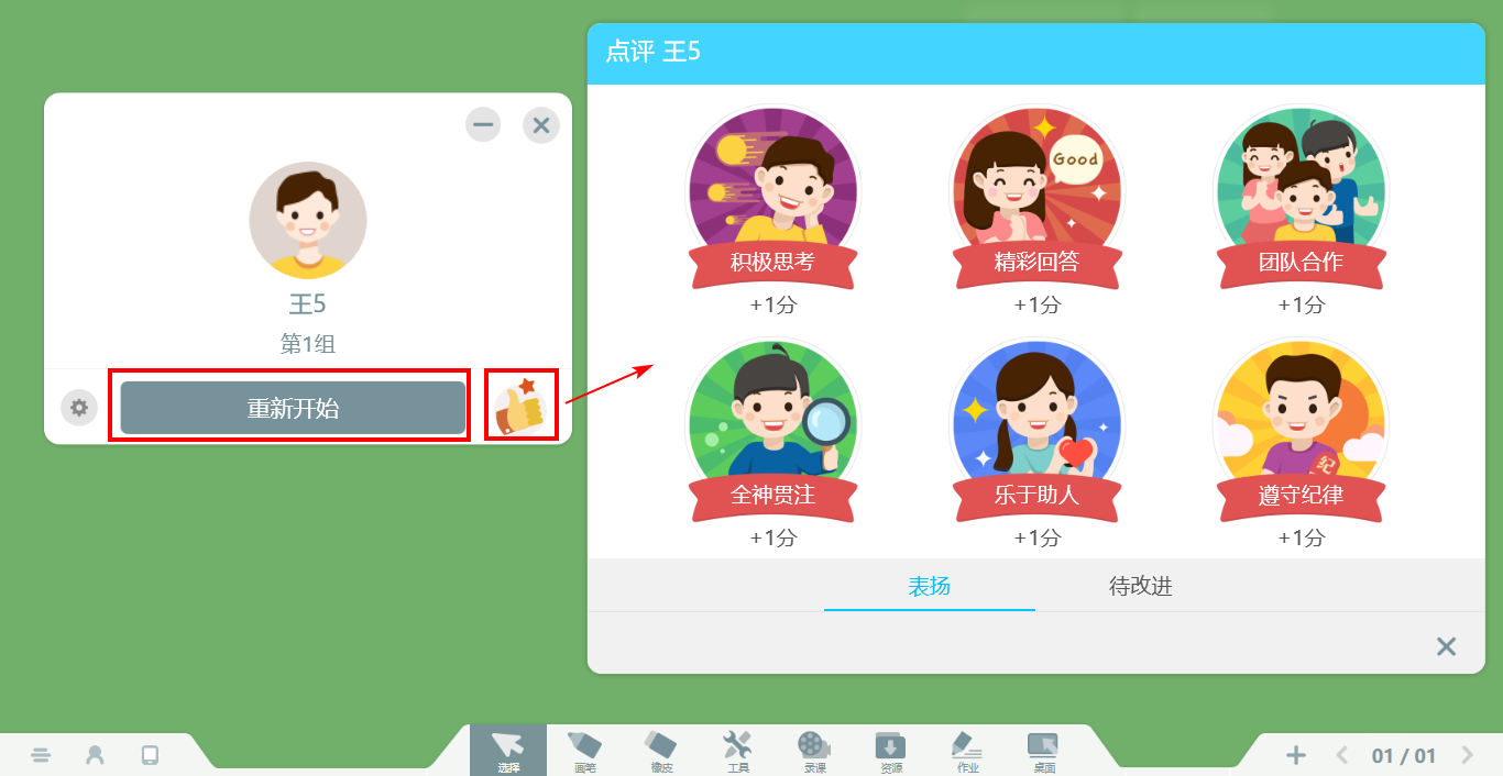 挑选出学生后,可点击“重新开始”再次挑人,也可针对学生的回答,点击赞图标,进行打分表扬后者减分警告。