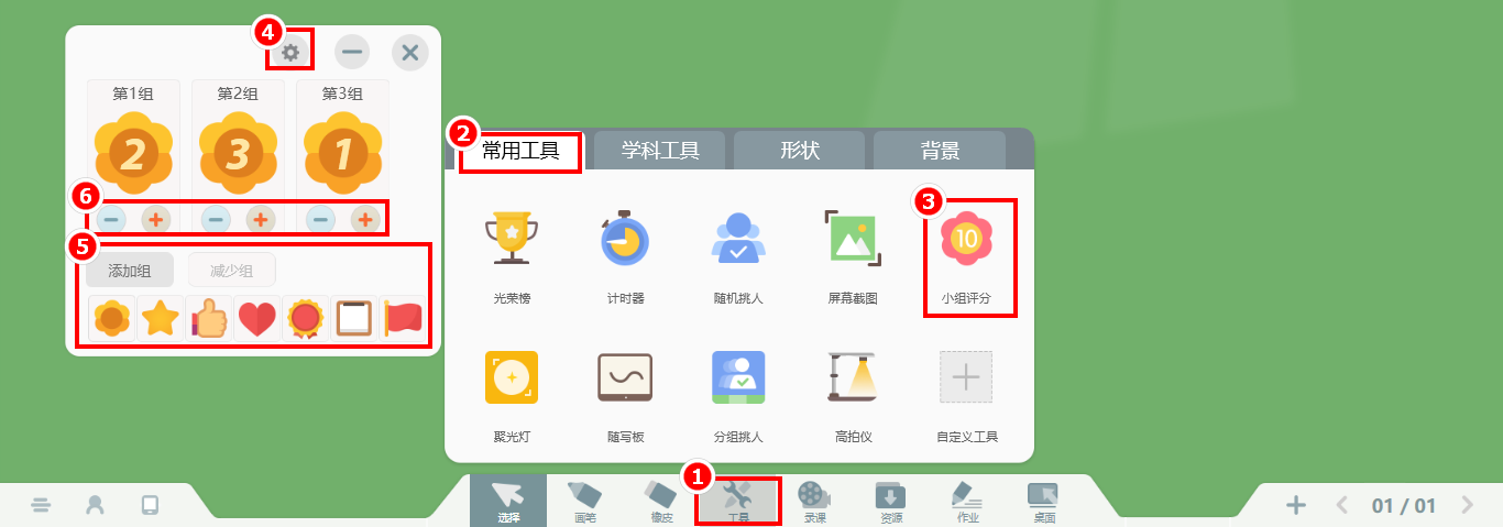 光荣榜是针对已经分好的组别进行打分,如果课堂上需要临时分组进行PK,可在“工具”—“常用工具”中点击“小组评分”,可点击设置按钮,“添加组”、“减少组”、更换图标样式、点击“- +”可给小组减分加分。