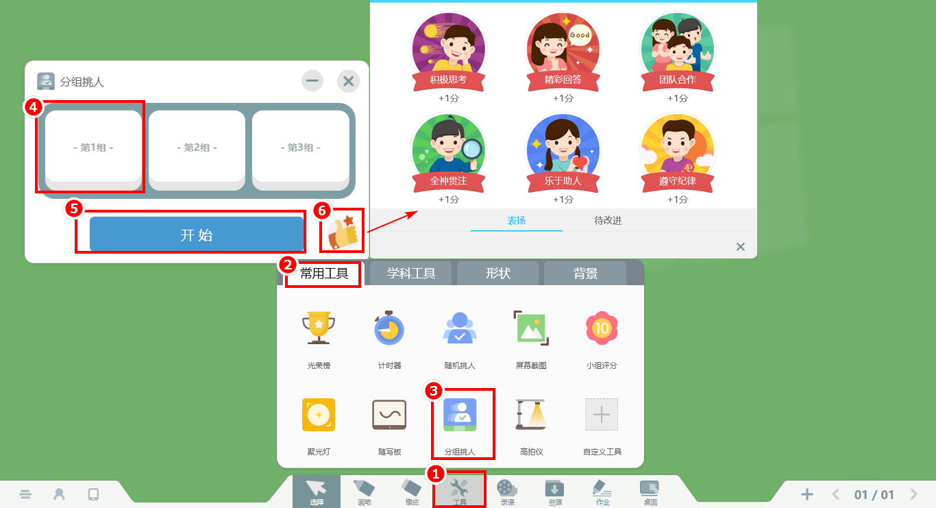 在“工具”—“常用工具”中点击“分组挑人”,即可按已经分好的组别进行挑人。点击单个组别可以单组挑人,点击“开始”可以多个组一起挑人,根据学生的回答情况,可以点击赞图标进行进行打分表扬后者减分警告。